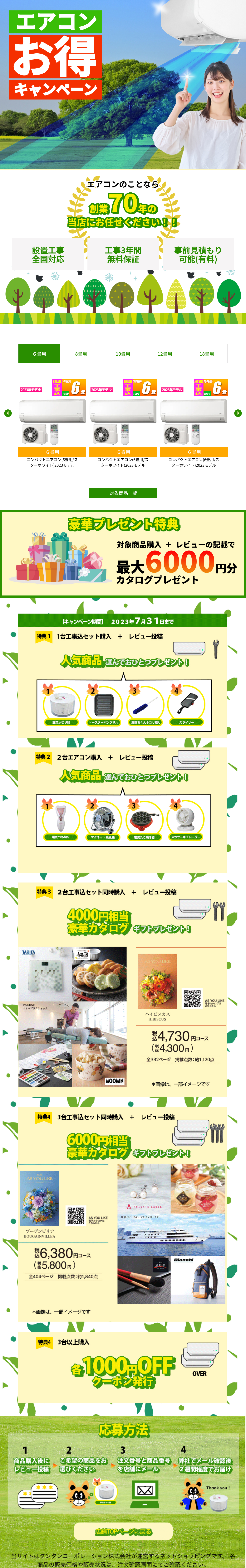 カラーメインカラーは緑(#298E00)を使用しています。理由としては省エネや節電に特化したエアコンを多く取り扱っていることから自然の色を使い環境に優しいことをアピールしています。